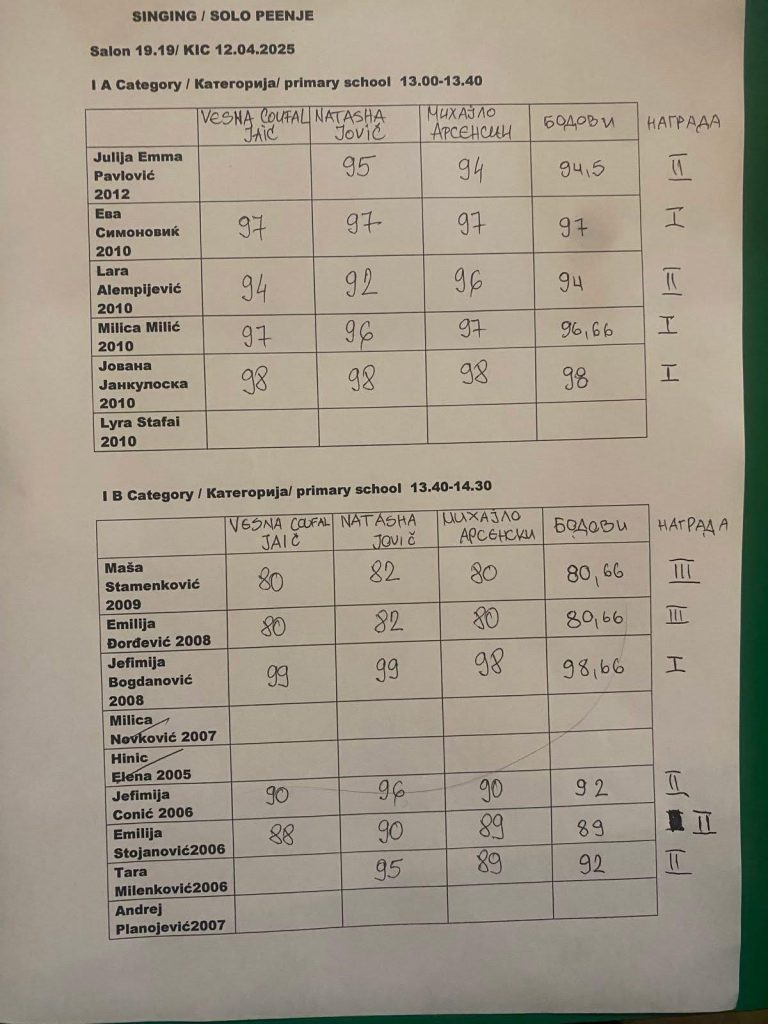 Apr 12, 2025adminUncategorized Денес на Меѓународен натпревар ,,Полихимниа”нашата ученичка Ева Симоновиќ во класа соло пеење на м-р Ивана Андоновска освои 1 место Честитки за Ева и нејзината менторка